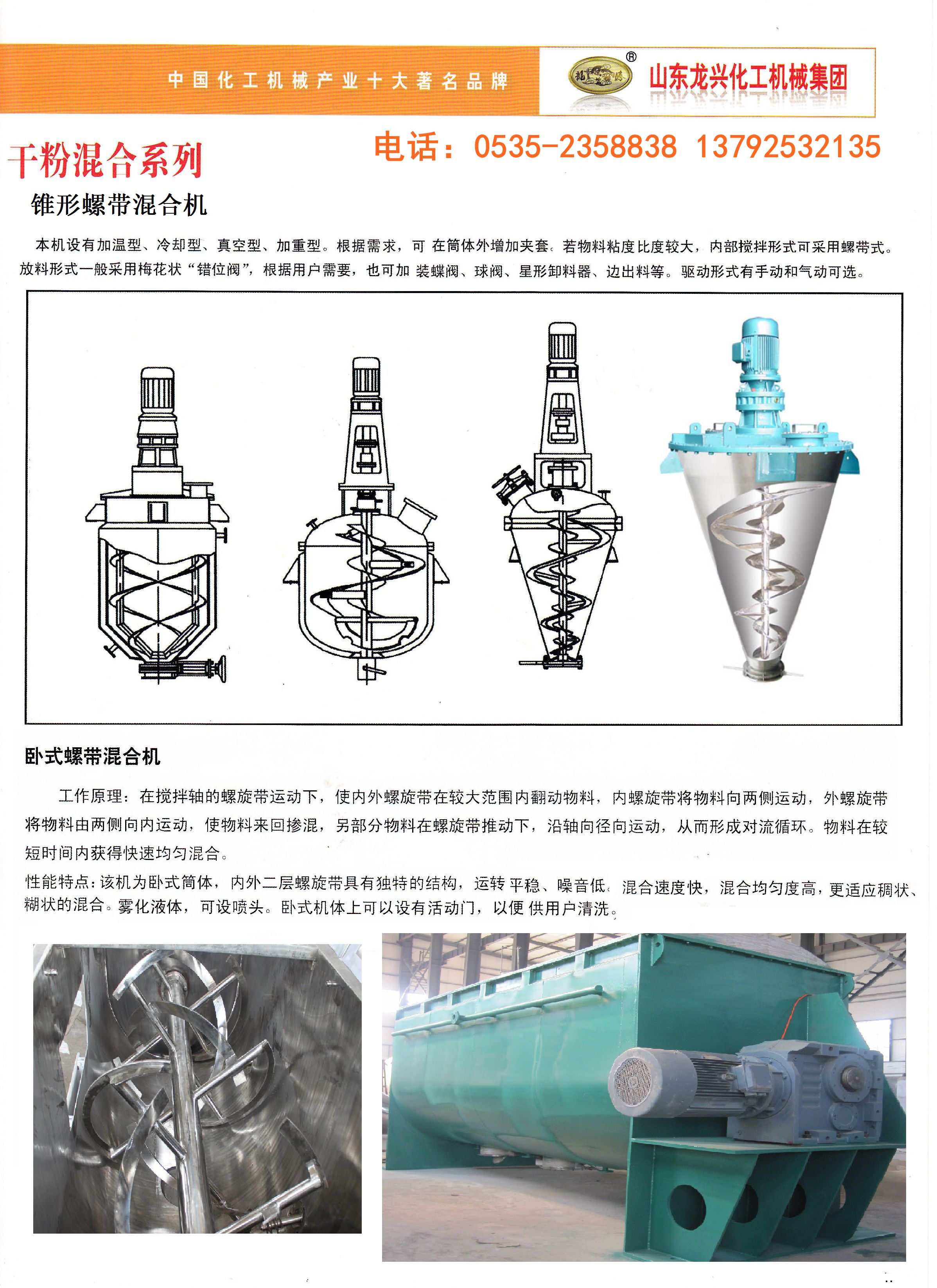 *双螺旋锥形混合机 *卧式犁刀混合机 *卧式无重力混合机 *成套干粉设备 *干粉输送设备 *V型混合机 *锥形螺带混合机